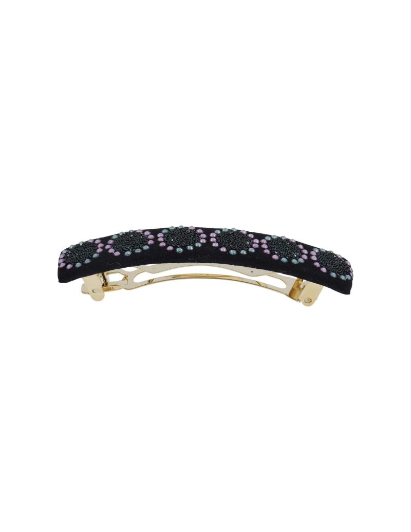 ・クリスタルファブリックの上にクリスタルのサークルが並び、上品でシャイニーなブラックの美しさが際立つバレッタ。