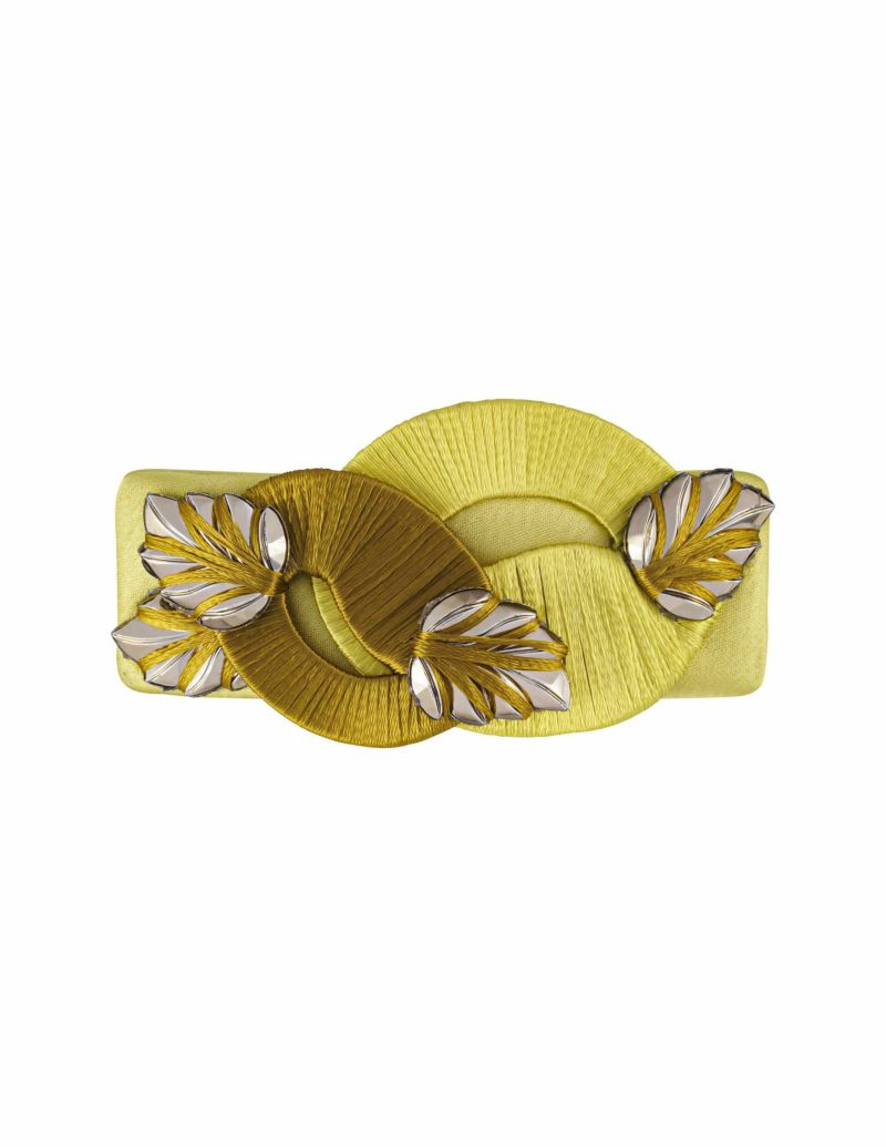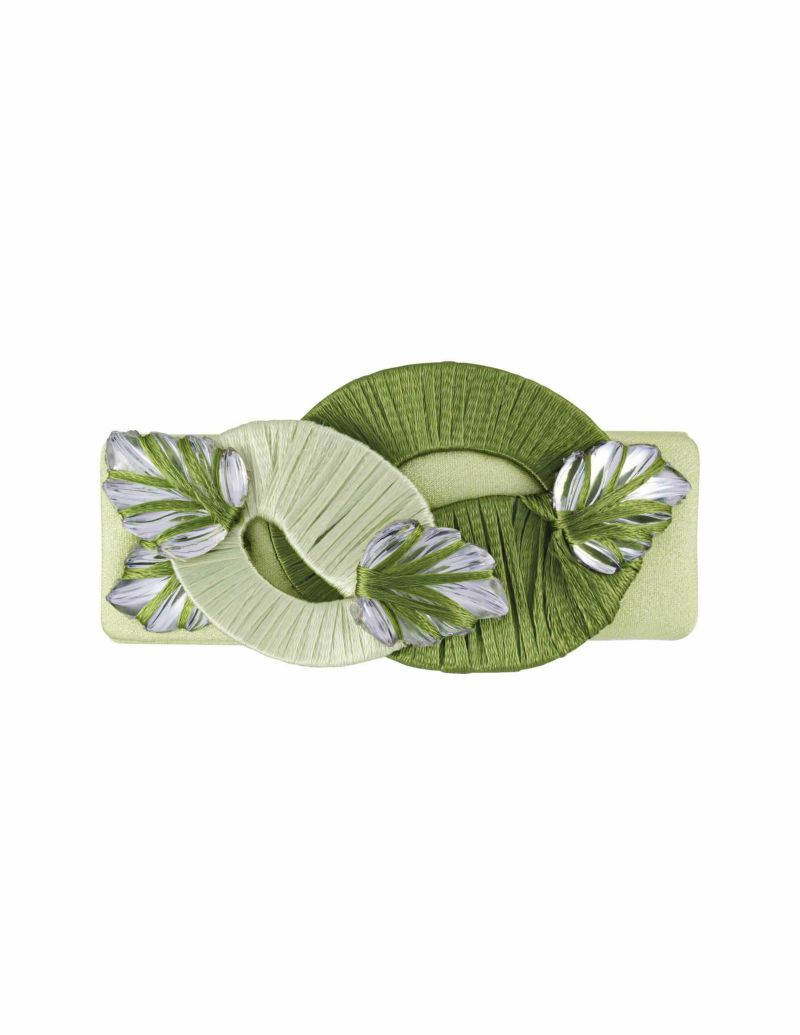 スパイシーな色彩を取り入れ、自然への回帰を大胆でリズミカルに表現したオールハンドメイドのバレッタ。