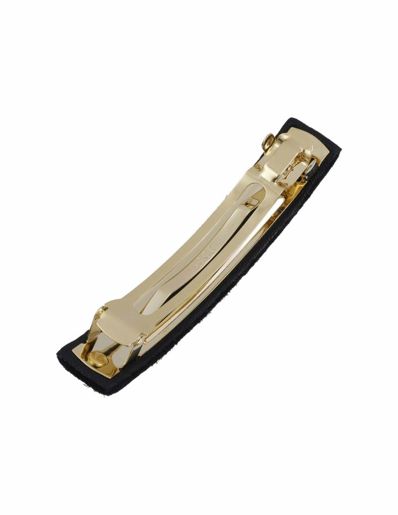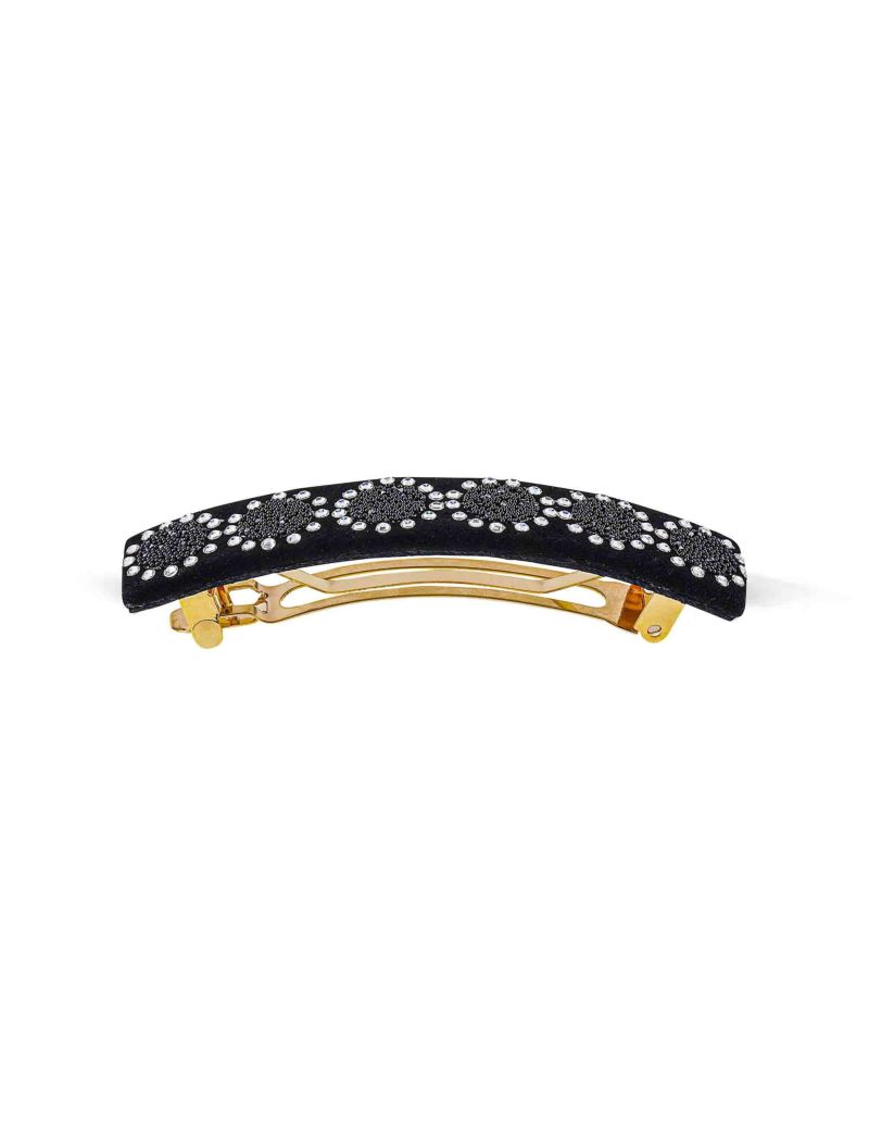 ・クリスタルファブリックの上にクリスタルのサークルが並び、上品でシャイニーなブラックの美しさが際立つバレッタ。