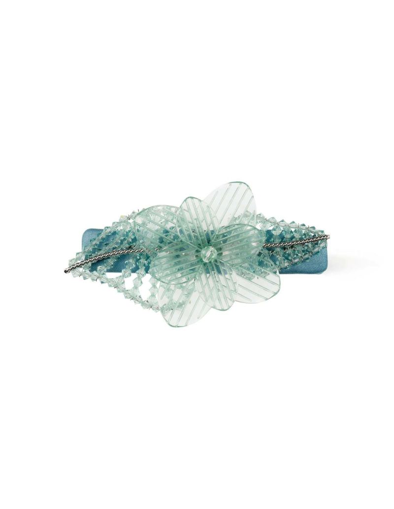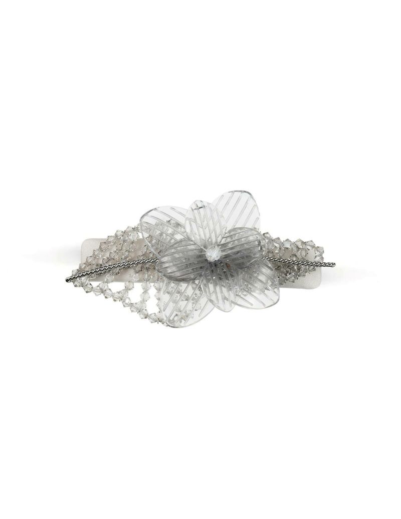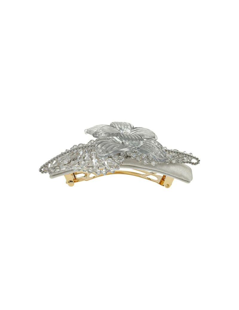 透明な樹脂とクリアビーズを、まるで光の網で束ねたような、フラワーモチーフのバレッタ。