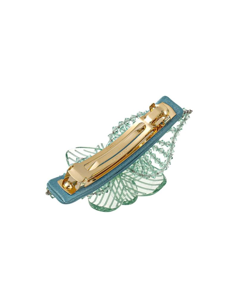 光を受けたビーズの煌めきが、儚くも静かに輝くクリアのバレッタ。