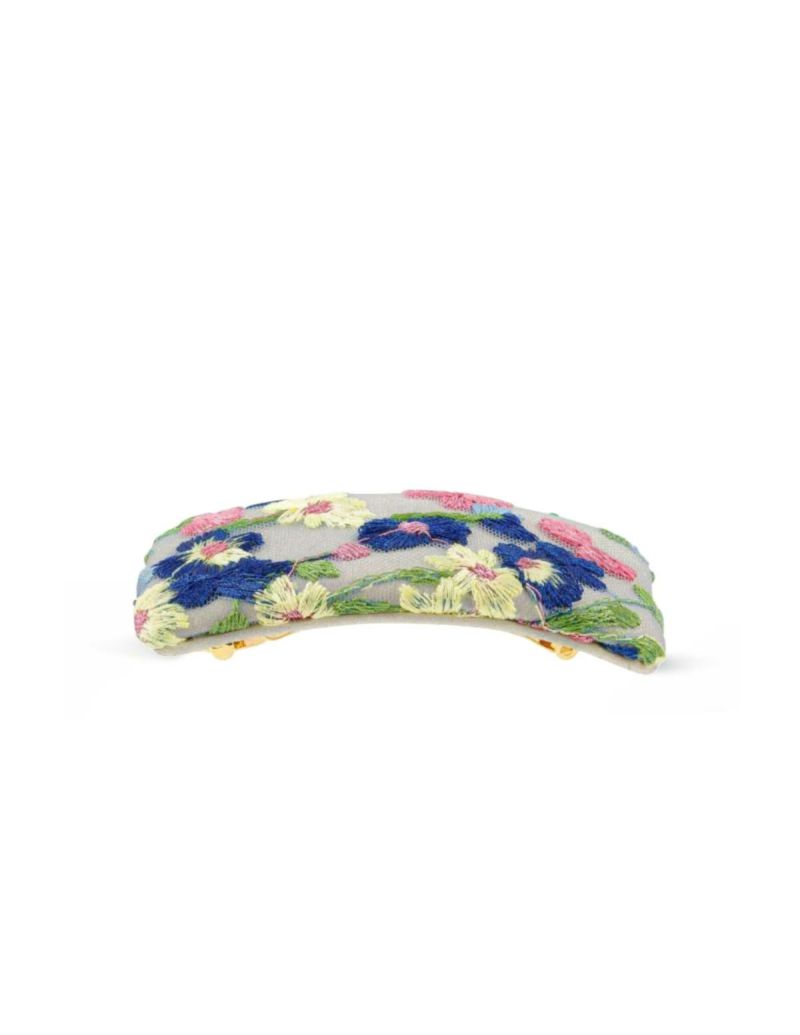 ・ペールトーンのフローラル刺繍のチュールをサンドベージュのベースにかけた膨らみのある華やかなバレッタは