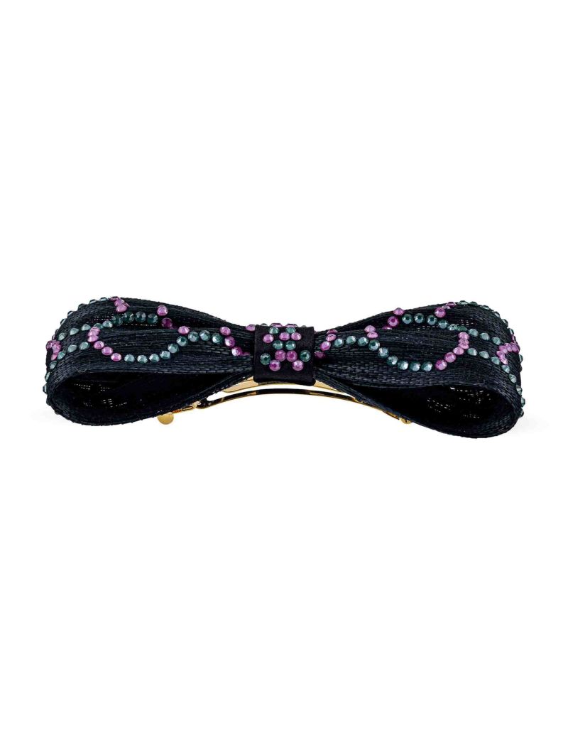 ・クリスタルファブリックの上にクリスタルのサークルが並び、上品でシャイニーなブラックの美しさが際立つリボンバレッタ。