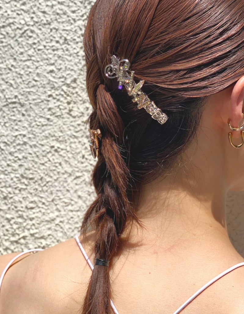 シルバーに輝くバレッタにはエナメルやラインストーンでハッピーワードのレタリングが隠されています。過去でも未来でもなく光り輝く今を見逃さないで!太陽はあなたを味方しています!!