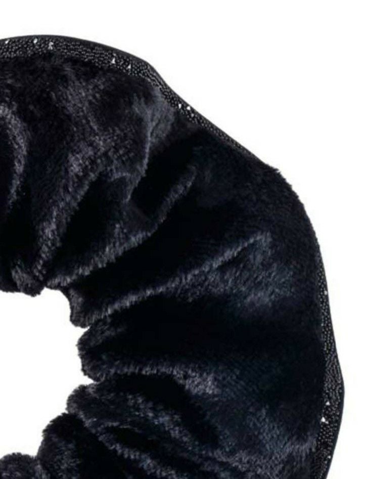 上質なシルクベルベットの艶やかな質感と、毛足の長い独特の素材感が特徴のシュシュ。同色のクリスタルファブリックでパイピングを施し、控えめながらも洗練された存在感を演出します。